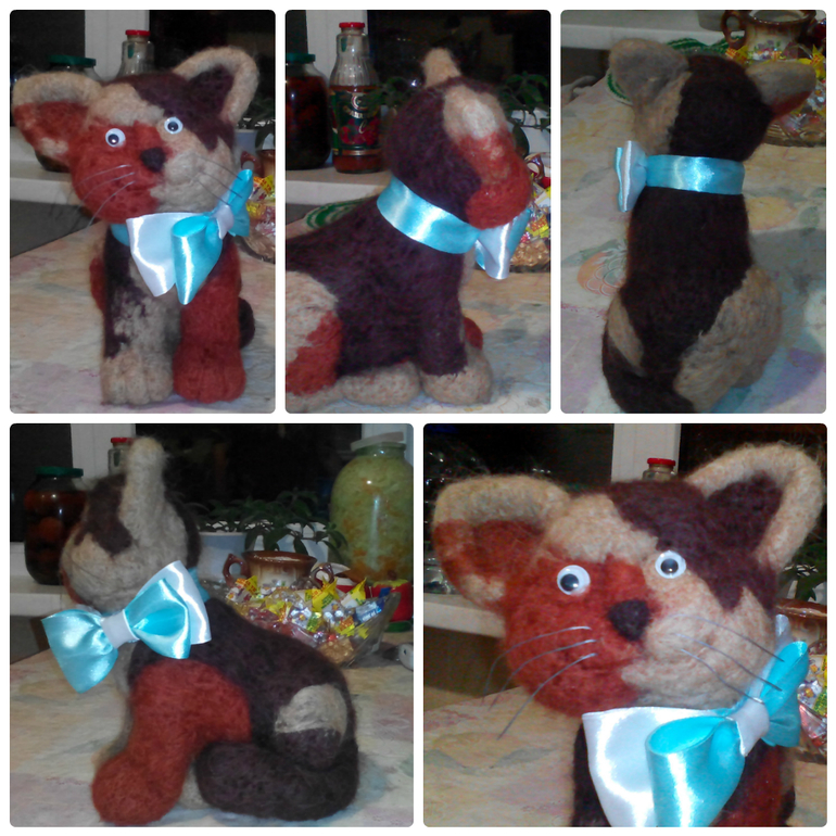Да, это бы его действительно оживило немного. Сначала хотела глазки сделать, как у настоящего котенка, но не получилось свалять хорошо веки. Пришлось их ввалять и приклеить глазки игрушечные. А про реснички думала сначала сделать из ниток так же, как и усы, но побоялась испортить. Потом узнала, что реснички отдельно можно покупать к глазкам (я этого не знала, к сожалению)