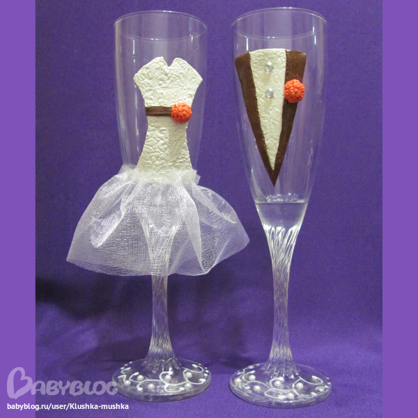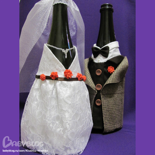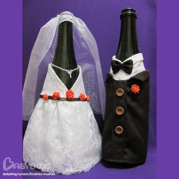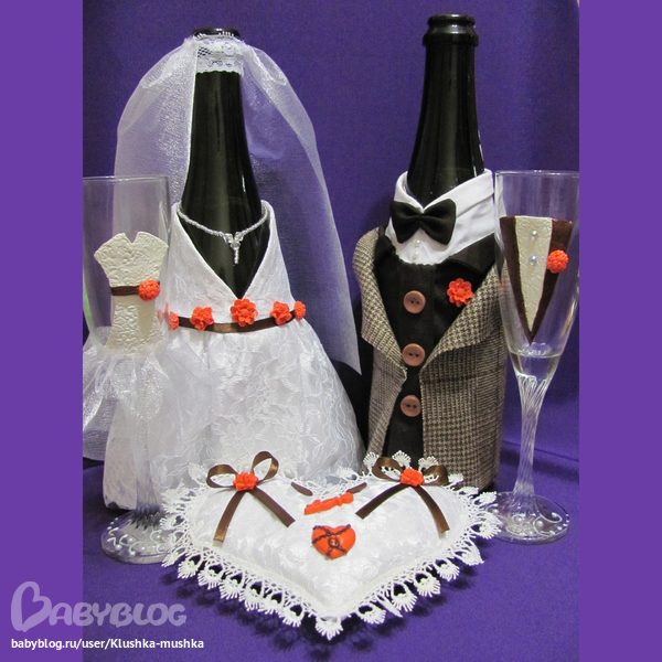 ДекорированиеЕще до нового года ко мне обратилась девушка и заказала съемную одежду на шампанское и бокалы для своей свадьбы. Свадьба у них коричнево - коралловая. Жениха нужно было сделать в пальто. Сначала я отказалась, так как съемную одежду раньше не шила. Но она больше не нашла никого, кто мог бы воплотить в жизнь ее задумку. И я не смогла отказать, с условием, что если не будет получаться, то оплету шампанское лентами (это я уже делала).