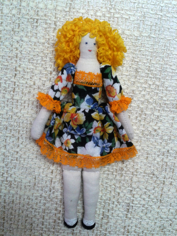 Другая куколка еще поменьше. Я её пока зову просто БЛОНДИНКА. Рост= 21см. Обувь и носочки-нарисованы акриловыми красками. волосы делала по совету подруги. Намотала шерстяные нитки на тонкие спицы, завернула в 2 целофановых пакета и кипятила 15 минут, Вынула, остудила, оставила до следующего дня. когда размотала, то получилась вот такая кудряшечка.