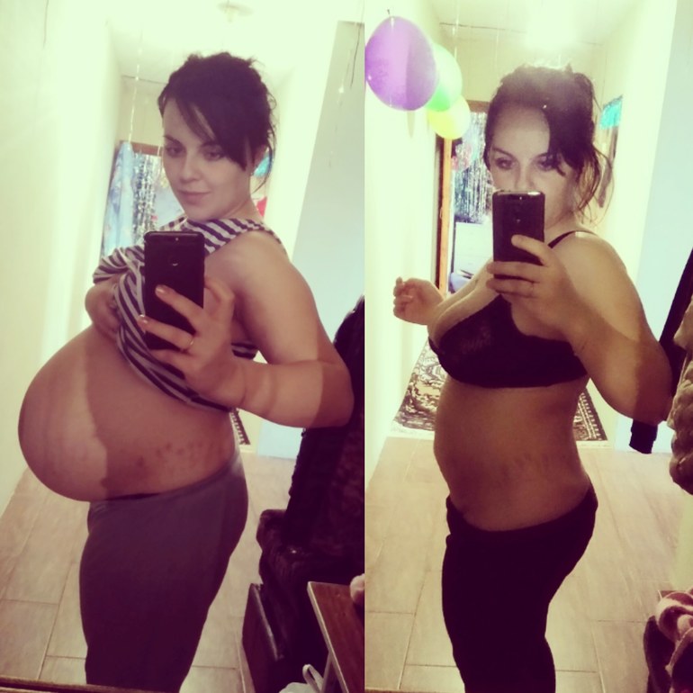 Сегодня 28 дней после родов, я влезла в свою юбку S размера,а во время Б носила и L и Xl:)