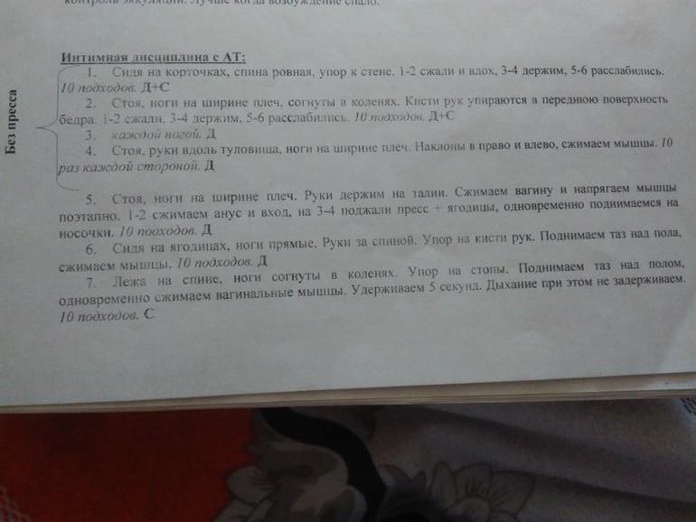 УпражненияВообщем прошел год,а состояние мое только ухудшилось.Диагноз-цистоцеле.если до этого только моча подтекала,то теперь прибавилось и неполное опорожнение мочевого пузыря. Когда-то давно была на семинаре по интимной гимнастике и там нам презентовали автономный тренажёр Никитиной. Вот теперь решила,что самое время заниматься и с помощью его подтянуть интимные мышцы. Очень надеюсь,что поможет,так как на операцию ну очень не хочу ( Только вот не совсем могу разобраться с инструкцией.девочки,помогите.Включая логику,как думаете,что значат абревиатуры Д+С, Д, С, ТА? Ну,АТ-это автономный тренажёр,а остальное не могу вспомнить!