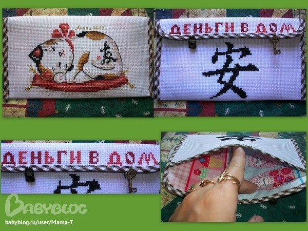 Это вариация на тему "Панновских" денежных котов. Центральная вышивка - кот, это набор фирмы "Панна". Долго я думала, как мне обыграть вышитое и решила, раз отрез канвы позволяет, сделаю из него конверт. Дальше - импровизация. Схему иероглифа нашла в гугле, надпись "деньги в дом", взяла из схемы оберега.