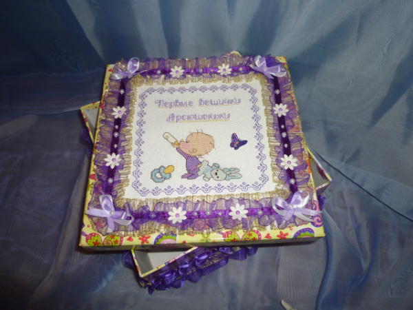 Коробка для первых вещей, фартушек и мешочек пожеланий.