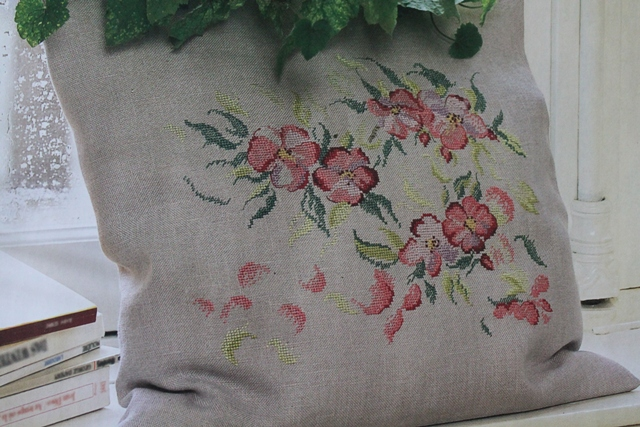 На мой взгляд, эта подушка с чайными розами очень подходит к панно с изящными космеями и кухонным занавескам и займет свое место на кухонном уголке