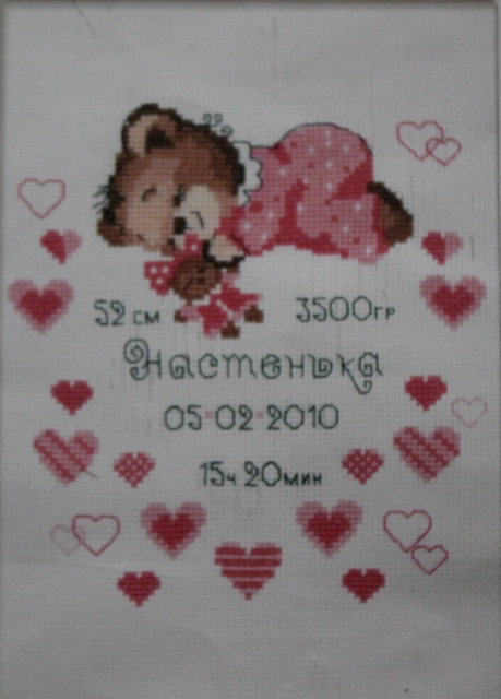 А по этой схемке вышила метрику для дочурки Полиночки. На ней я вновь вернулась к вышивке после долгого перерыва. Оформить все никак не могу(((