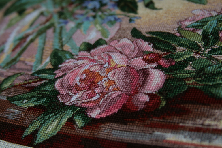 Вышивка крестомВышивала целый год, с небольшими перерывами. Не хватило ниток двух цветов - самой светлой в фоне, пришлось заказывать у производителя (прислали через месяц) и для бэка листьев, но заказывать еще раз и ждать месяц уже не было сил, поэтому доделала ниткой чуть светлее (надеюсь, что это не очень бросается в глаза).