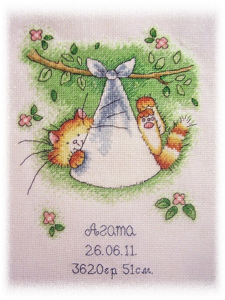 Вышивка крестомНу уж очень шаловливый был))) никак мне не давался. Такой же хитрющий, как и сама Агаточка. При глажке обнаружила, что вышила рост Дани 56 см..потом распарывала в 3 часа ночи. Обладательницы в восторге, жаль, что фото у меня другого не осталось. Канва с люрексом, моя любимая. Котенок от Маргарет Шерри, вышивала по схеме из интернета ужасного качества, хорошо, что хоть ниточки взяла родные ахнор, они мне очень понравились. Мне еще Ришка помогала с цветочками, хитрые полукрестики, по крайне мере для меня. Очень довольна в итоге и процессом и работой.