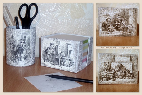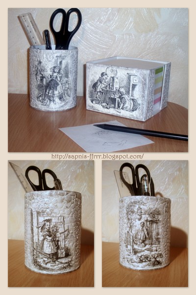 Надекупажилось для урока с псевдокракелюром из скорлупы яичной - 2 ночера его клеила, но оно того стоило =) Получился канцелярский набор из баночки из-под детского чая и кообочки для блока листиков:
