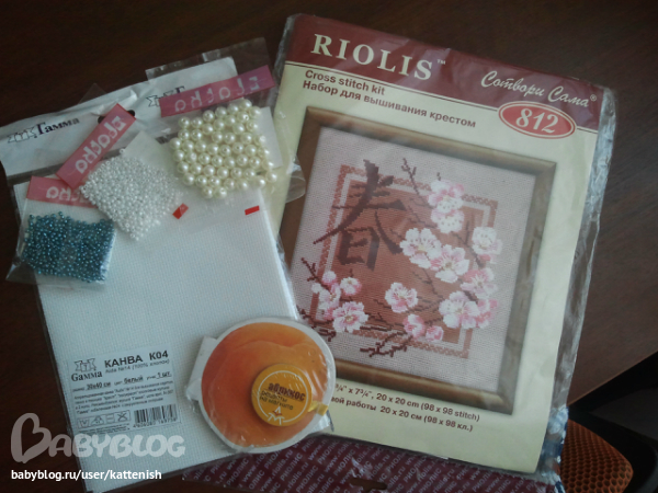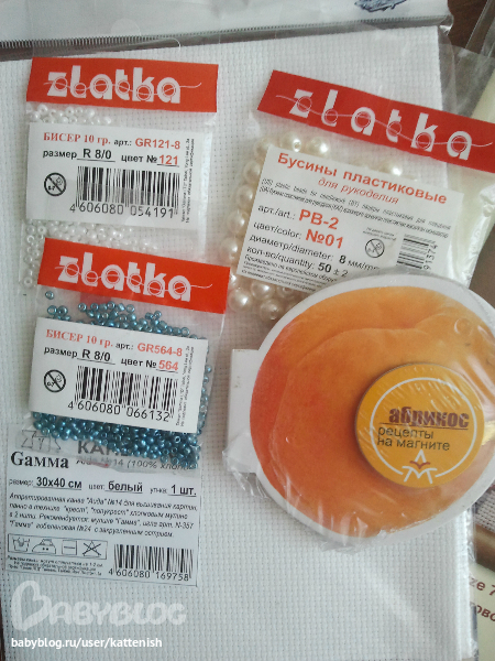 Набор от Риолис (был вскрыт , но абсолютно новый), канва Аида 14, бисер и магнитик с рецептами + будет что нибудь еще :) но это будет мини сюрпризом ;)