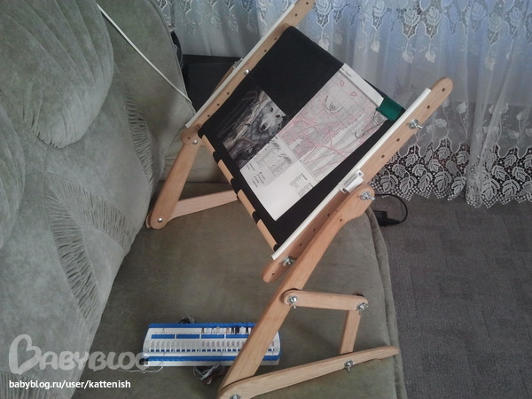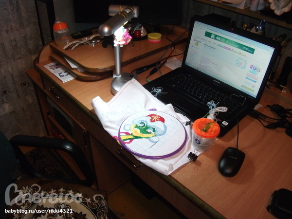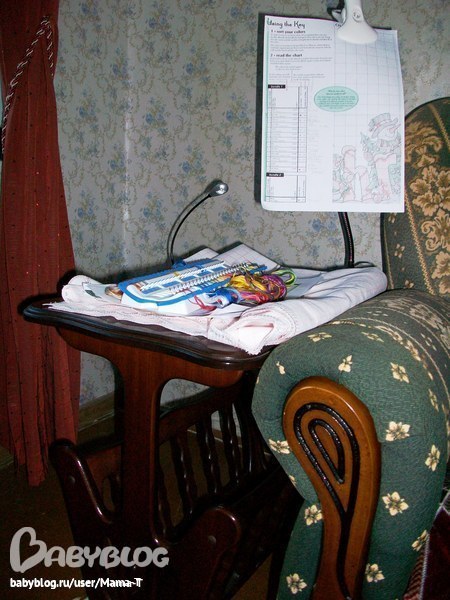 Все под рукой. Станочек, компьютер,чтоб в перерыве на ББ зайти, небольшая коробка с интсрументами. А в ней нитки, коробочка с иглами, коробочка с резинками, ручка, ключ к схеме, стаканчик под мусор, радионяня. Все компактно ,просто и удобно!
