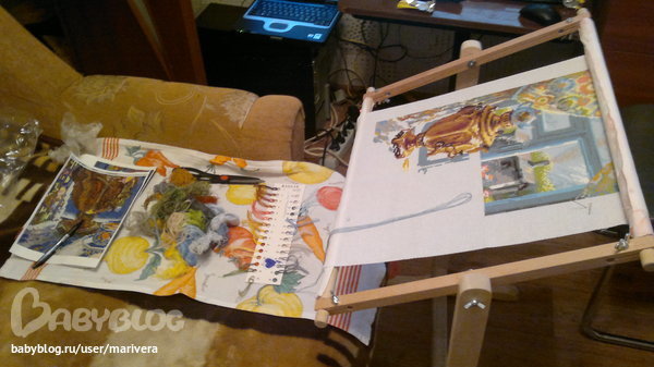 Еще я могу вышивать на диване, но только в том случае если за ноутом сидит мама)))) А так я сижу на своем мягком стуле и смотрю слушаю киношки-сериальчики и вышиваю.