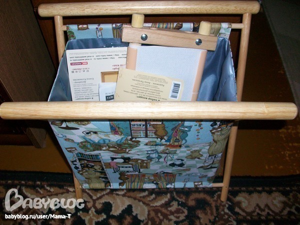 Есть еще диванный станок, но с ним как то не сложилось. Поэтому, вышиваю на гобеленовых пяльцах, которые храню в газетнице, рядом с рабочим местом.