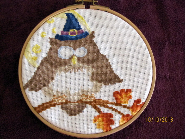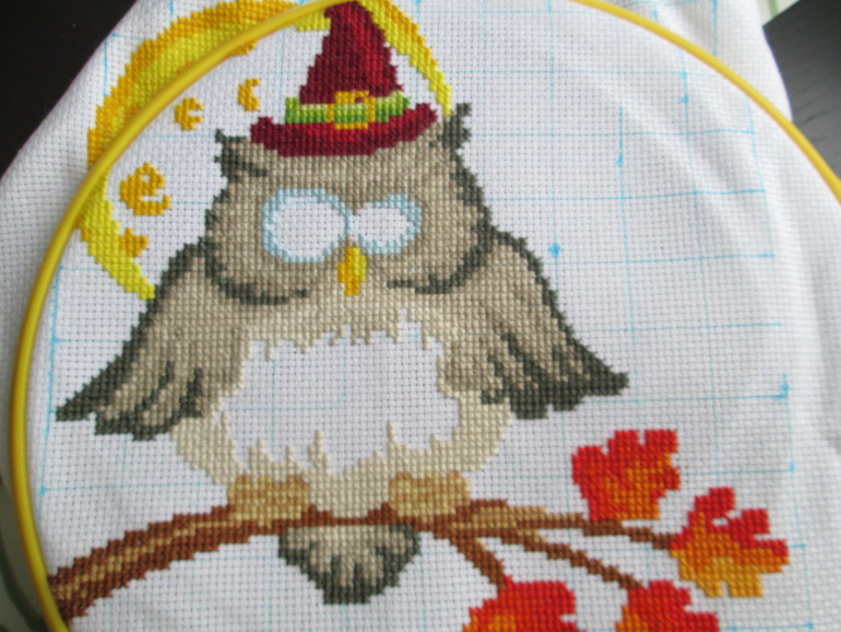 вот наконец и моя сова. зашла в ближайший магазин за нитками 3866 и, простите, офигела! 2 евро за пучок ниток! я естественно не купила, п.ч. последний раз, еще весной, покупала за 90 центов. правда в другом месте. пришлось вышивать тем, что было в наличии. из-за этого и задержалась
