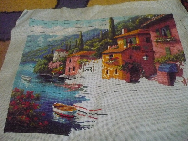 Я столько времени вышиваю эту картину, что уже забыла ее название))) По-моему... Городок на берегу озера....И еще спрошу у дочки сегодня, побежит она или нет...