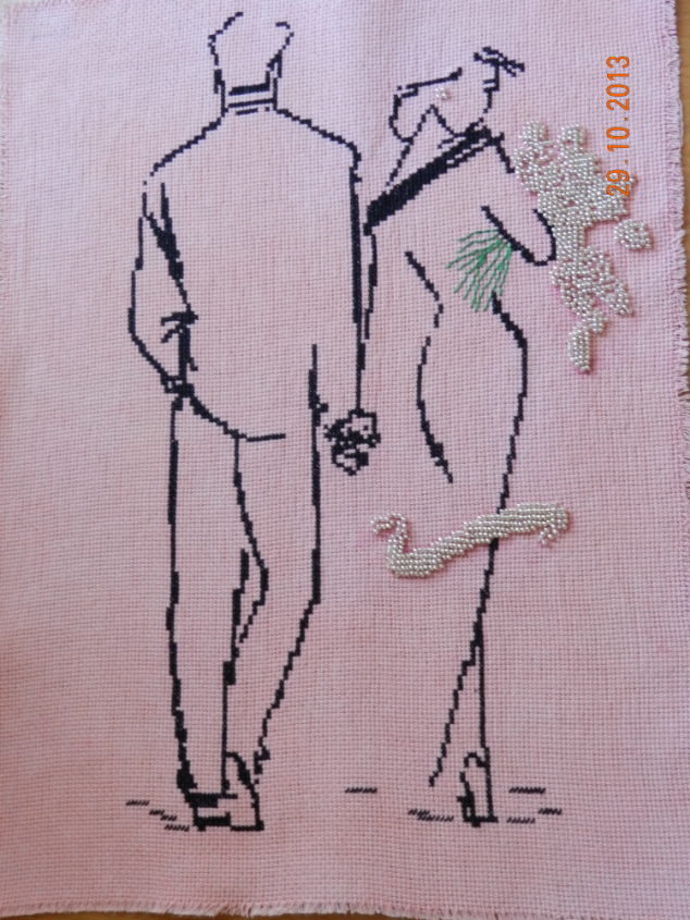 тут целая история.....изначально бисер был красный,но когда я постирала вышивку то бисер полинял на канву розовыми разводами!!!не чем не отстирывалась канва,пришлось ее покрасить,а бисер после стирки стал серебряным