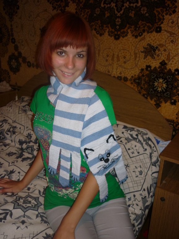 спасибо! а у тебя вот к вязанию талант! а я только носки -варежки.ну и безрукавку сыну связала .а еще был котошарф для сына .получился не такой как хотела и вязала оочень долго.вот он на сестре...