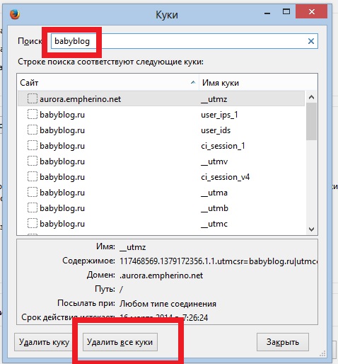 Могу подсказать если надо в гугл хром как сделать это....Кликай на кнопочку в правом верхнем углу или три полосочки или ключ.......настройки......настройки контента(если их не видно, то кликнуть на /показать дополнительные настройки\.........все файлы cookie и данные контентов.....в строке поиска напиши babyblog......когда выдаст результат выбери нужный и удалить все.......и далее ГОТОВО Надеюсь поможет.