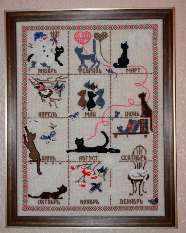 Вышивка крестомПросто не могла не вышить этот календарь. Во-первых он мне нравится, во-вторых у меня живут 3 кошечки, ну в-третьих в "хозяйстве" пригодится. Оформление классическое без стекла.