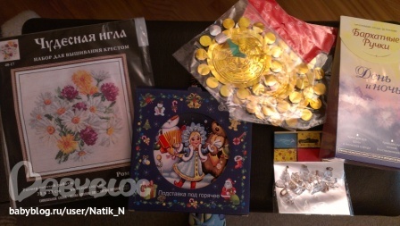Это замечательный наборчик с ромашками (там такая канва интересная, мне очень понравилась), подставка под горячее с праздничным рисунком, новогодние украшения и ооооочень полезная вещь - набор кремов "Бархатные ручки"! Вика, как ты угадала, это как раз то, что мне нужно, с моими руками это просто спасение!!! Спасибо!!!