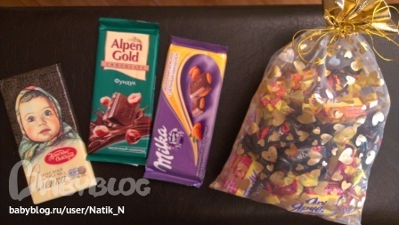 И конечно же десерт!!! Аж три шоколадки и мноооооого-мноооооого конфеееееееет в красивом мешочке!!! Ну всё, прощай, фигура )))
