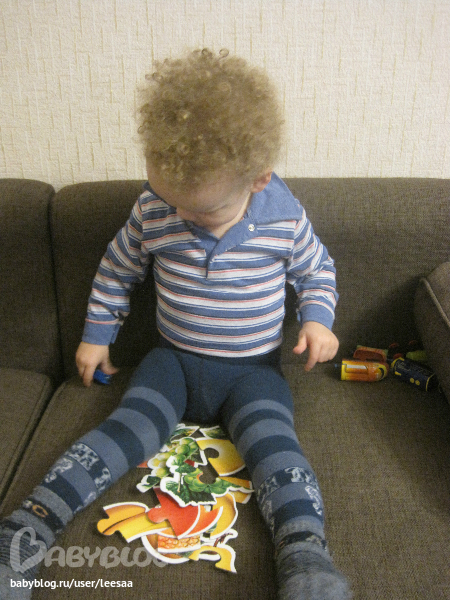 Амаля Оксана порадовала красивой футболочкой и невероятным нано-жучком, я о таком даже не слышала). Он очень прикольно ползает и вибрирует, даже нашему папе понравился (играл вместе с сыном), а он жуткий привереда). А еще Амальке достался набор замечательных фруктовых пазлов, бананы нам понравились особенно)))