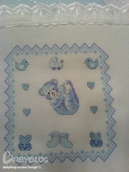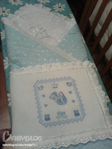 4.Еще одна моя старая работа 2009г.Это вышитый конвертик для роддома (сынульку я в нем забирала). Его я еще не показывала. С ним такая история приключилась: Забирала я в нем сыночка из роддома и медсестра, которая выписывала, попросила его напрокат дать для своего внука, который вот-вот должен был родиться. Я дала, и с концами... Телефон этой медсестры потеряла...Роддом,где рожала закрылся через месяц... В общем пропал конверт. И тут недавно на местной барахолке на Авито вижу - мой конвертик продается! Короче, я его выкупила обратно совсем уже у других людей. Интерессно,сколько малышастиков в нем выписалось!?
