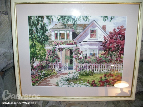 Когда мы покупали дачу, я увидела этот дизайн, и жутко захотелось, чтобы у меня был именно такой домик. Не поверите: оформление купленной дачи шло очень долго, за это время я картину вышила, оформила и, когда ехала забирать из багетки, мне позвонили и сказали, что все документы готовы и дача уже совсем МОЯ!