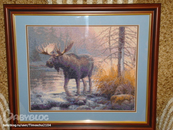 Их уже отдала в багетку и забрала ранее вышитые работы. И так, мой лосик: