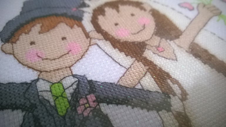 В оригинале на схемке невеста д.б. блондинка, но у сестры волосы каштановые, поэтому нитки сама подбирала. Галстук у жениха не спроста салатовый - у него машина такого же цвета. Платье невесты цвета айвори, поэтому все подгоняла.