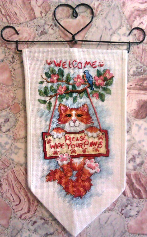 Приветики!Вышился вот такой котик.Это мой первый баннер,поэтомк уголок не идеален и в целом неаккуратно смотрится!Как найду мастер-класс-переделаю обязательно.Отдыхалочкой назвать не могу-ушел месяц.Жду ваши комменты,что и как надо переделать.