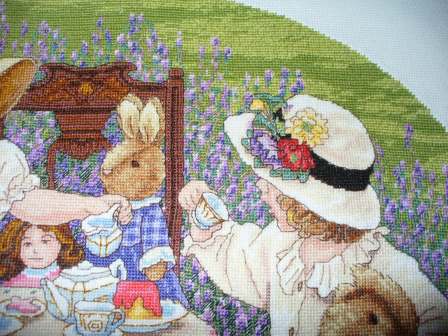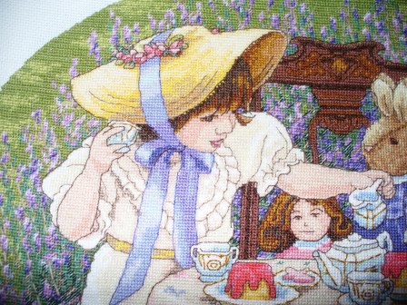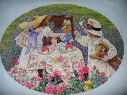 Итак Afternoon Tea - моя любовь с первого взгляда... Создан по картине Сандры Кук. Жаль что Dimensions снял его с производства, поэтому мне пришлось его вышивать по китайскому набору, купленному в "Хомкиной лавочке". В наборе все понравилось, а ниток осталось еще на 1/2 работы. В набор входила 18 канва Аида, ниточки ДМС (Франция), игла и очень крупная и удобная цветная схема. В работе использован крест в две нити, полукрест от одной до шести нитей,бленды, бэк, фр. узелки и ленивые маргаритки, а еще металлик в сервизе можно увидеть.