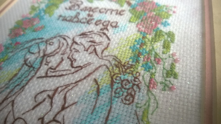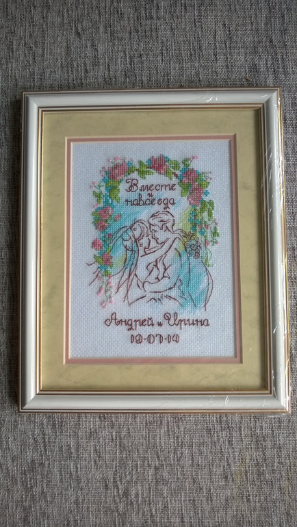 Лично я впервые вижу этот сюжет, хотя долго выбирала метрику для вышивки для подарка (так и не выбрала, решила шить оберег). Мне она понравилась многим больше остальных — и не банально совсем. Нежная! И отшита хорошо)