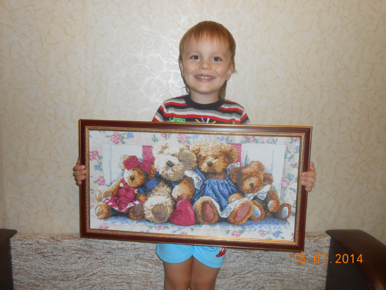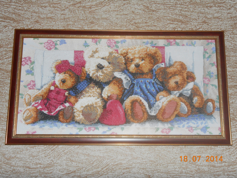 Вышивка крестомТолько вчера из багетки. Больше 3 лет не вышивала, соскучилаась. Около 3,5 месяцев ушло на семейку мишек, год на них заглядывалась, вышивала и наслаждалась