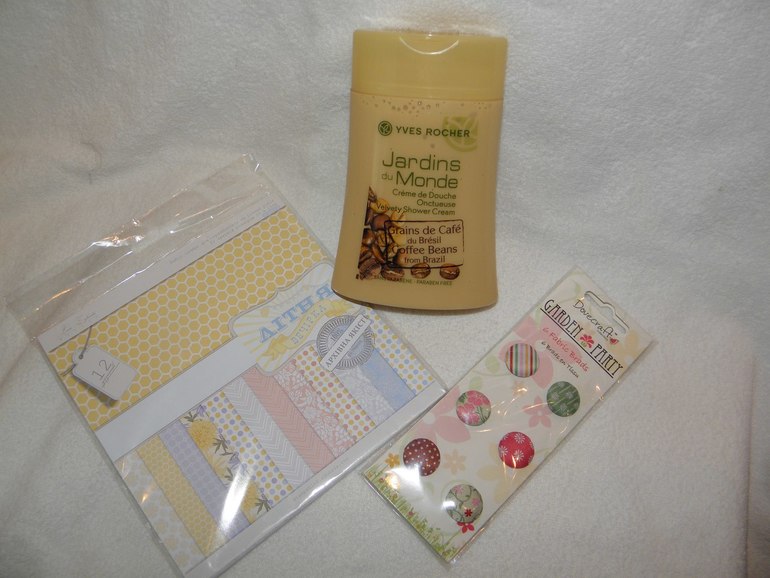 А это подарочки моему скраповому хомячку(наборчик бумаги и интересные тканевые брадсы) и ароматный подарочек для душа!гели для душа не люблю,но именно этот единственный,которому принадлежит моё сердце)))