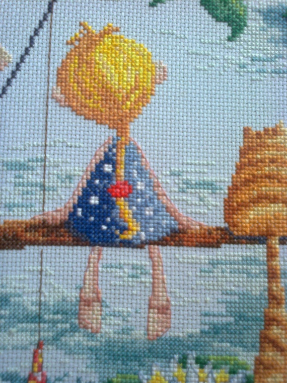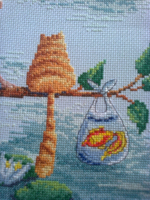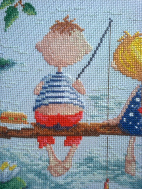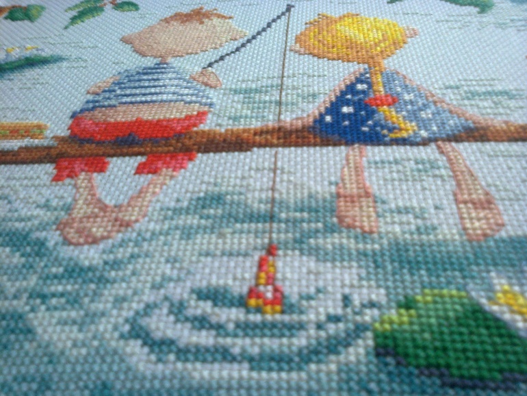 Это просто песня, а не набор! Вышивала 13 дней, картинка получилась очень радостная и яркая. Из швов только крест и чуть-чуть бэка, 30 цветов. Мужу очень понравилось, он все ждет, когда же с малышами можно будет на рыбалку ходить)))) Попенял только, что кота надо было черного делать, и было бы полное совпадение.