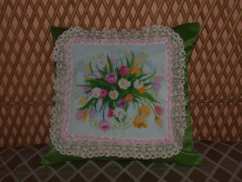 Обалденная подушка!!! И цвет наволочки,и кружева....всё сочетается с такими нежными тюльпанами
