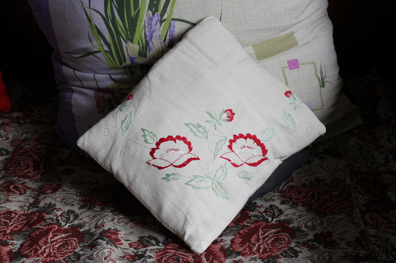Подушка с вышивкой, направление верхних стежков крестиков разное, материал - обычная хб ткань.