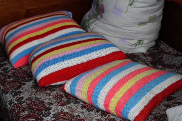 Дома у нее очень много рукодельностей. Вообще она любит вязать крючком, спицами. Модераторы, если крючок и спицы не вписываются в тему, могу удалить)