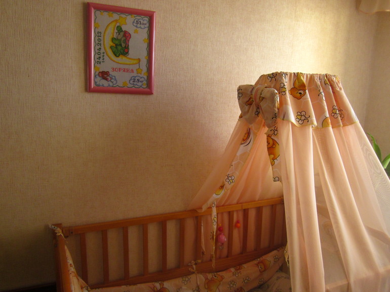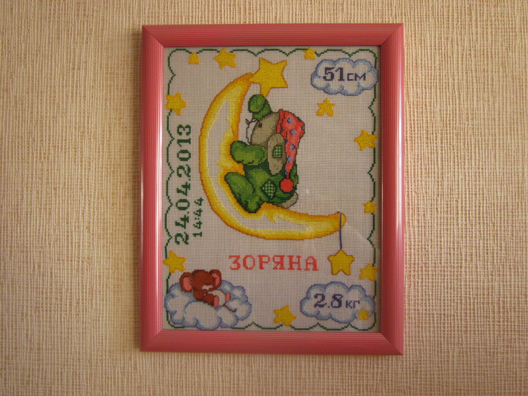 24 апреля появилась на свет мое чудо - моя доченька Зорянка. Так как раньше любила вышивать, решила сделать дла нее метрику. Долго выбирала схему, попадались то слишком тяжелые с сотней цветов, то слишком легкие. Сначала хотела чтобы на картинке был именно ребенок, но потом увидела этого кролика и он мне очень понравился. Вот такая картина теперь висит над кроваткой моей доченьки.