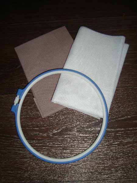1. Два куска канвы белая (50*40) и бежево-коричневая (50*30), пяльца пластмассовые круглые