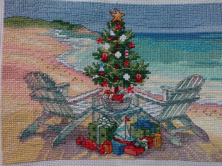 Спасибо за переворот!Пустые места в прибое и стульях-так задумано, где парусники на елке тоже. А где пустые места на елке в виде кружков-там должен быть бэк в виде алжирского глазка, но там я паетки как раз хочу попробовать. И на гирлянде бисер