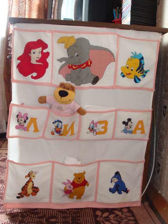 Вышивка крестомКогда-то, 11 лет назад, когда моя дочка была совсем крохотной, я начала вышивать диснеевских героев. Долго не могла найти им применение, в рамки оформить не очень хотелось, слишком много картин получилось))) и вот в одну прекрасную ночь, пока малышка спала, родилась у меня идея сделать ей кармашки на кроватку. И буквально на следующий день я поехала в магазин за цветной канвой. Сначала хотела сделать с желтым цветом, потом решила с розовым. И вот что в итоге получилось)))