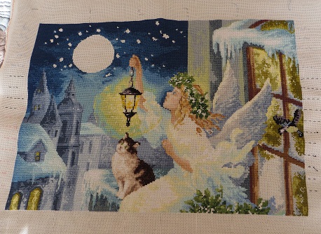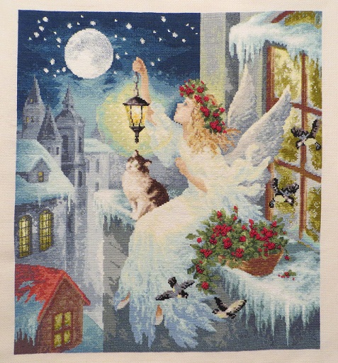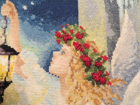 Вот и закончила я свой самый длинный по времени проект,получив от него массу положительных эмоций. "Зимняя фея", ЗР (61 цвет мулине,2 цвета бисера,светящиеся нити)