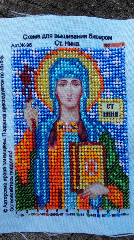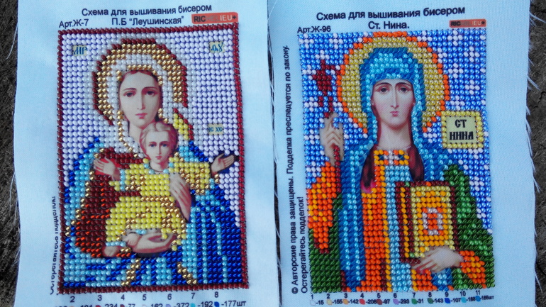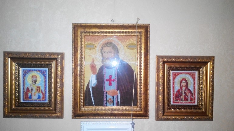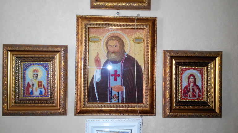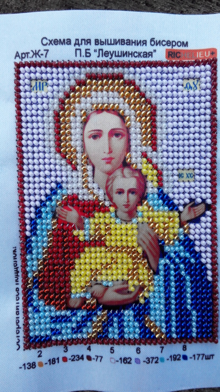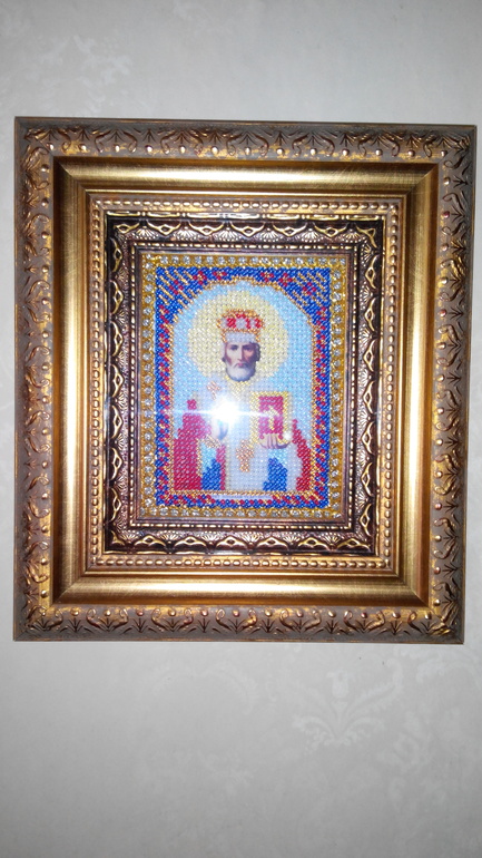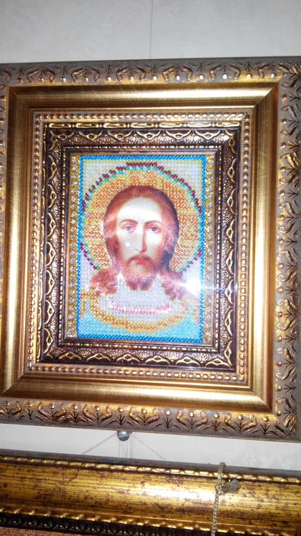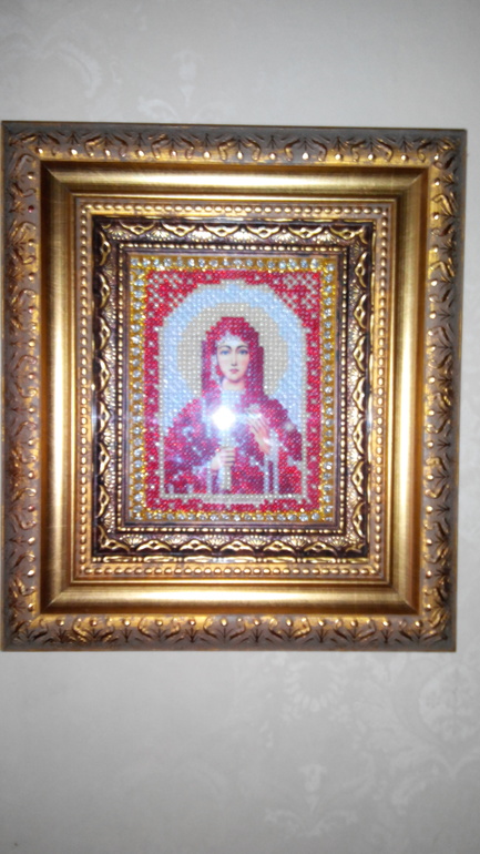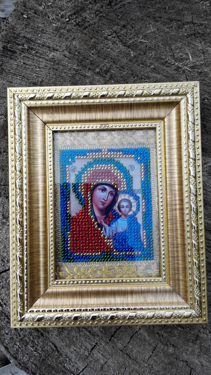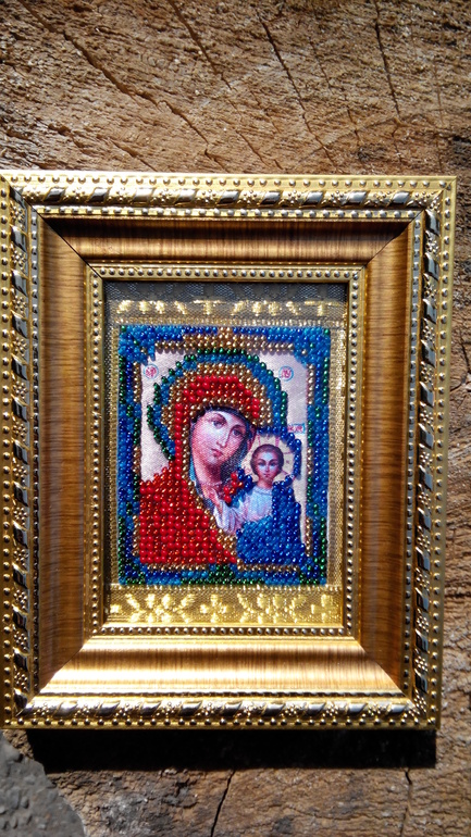 Икона Казанская Божья Матерь совсем малюсенькая, чуть больше спичечного коробка. Оформлена в рамочку, которая нашлась дома, а промежутки между рамкой и вышивкой задекорировала тесьмой. Только недавно узнала про такой способ и переоформила мамины иконы, которые я ей вышивала.Было так: