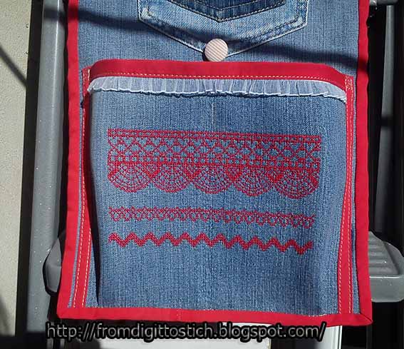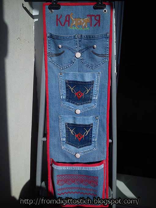 Машинная вышивкаПоявилась надобность в очередном органайзере для сада для младшей дочки. Сделан был из старого джинса и украшен вышивкой, пуговичками, чуток кружева. Доча осталась довольна.