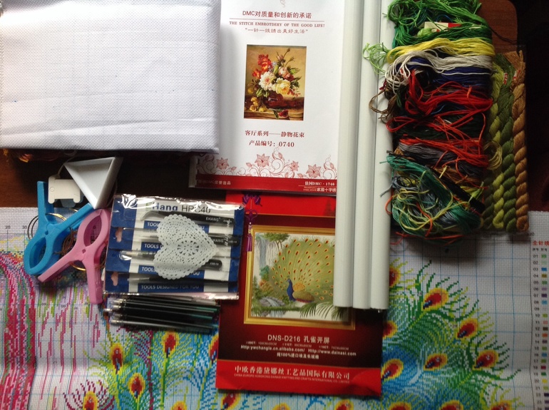 Радость ХомякаСегодня получила очередное удовольствие. Мария наконец-то отыскала для меня моего долгожданного Павлина, за что ей низкий поклон. Цветы в стеклянной вазе на 14 канве и нитки ДМС, а Павлин на 11 канве и нитки Китай. А ещё я получила картонные планшетки для мулине ( как у Ланарте), держатели на пружине для схемы( можно и канву закрепить на гобеленовой рамке), много- много стержней для расчерчивания канвы, китайских нитковдевателей полуавтомат, длинные скобы для снэпов, треугольнички и пинцеты для мозаики. Ну и конечно, подарочек от Марии: картонные бобинки для намотки ниток и металлический держатель для этих бобинок.