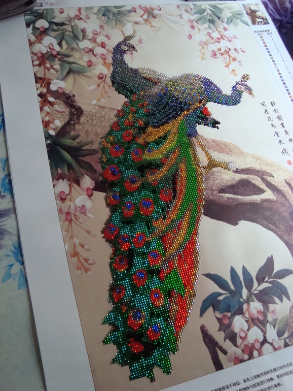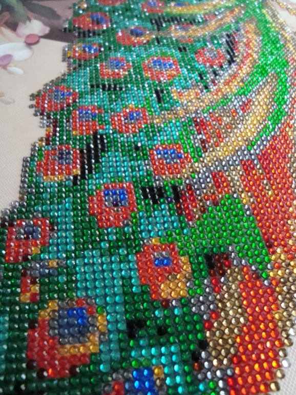 Интересно было выкладывать не квадратными смоляными алмазиками, а почти "настоящими" круглыми стразиками. Картинка получается намного ярче и "переливчатой". Пока выкладывала, все голову ломала - куда бы ее потом пристроить... А дочь как увидела, так всю мою пробемку и решила, сегодня сразу же и забрала себе)))))))