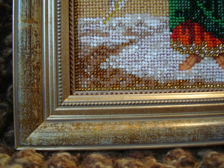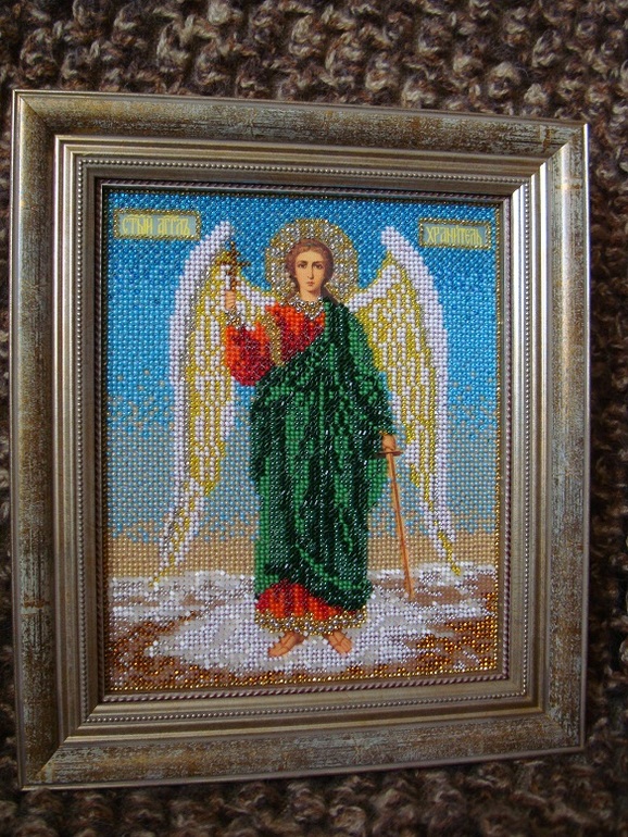 Икона Ангела Хранителя от Кроше. На иконе решила не экономить и выбрала музейное стекло, так как часто читаю что стекло скрадывает красоту бисера, а без стекла оформлять не хочу.