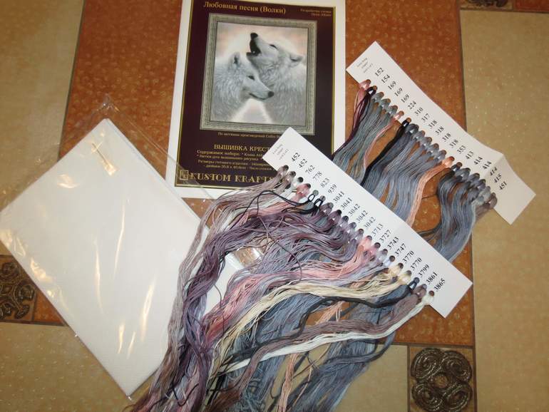 Решила вышить в подарок друзьям пару волков. Это мой первый набор Kustom Krafts, Love Song (Wolves), 35,6х40,6, аида 14, счетный крест. Долго думала. отшивов не нашла. Решила рискнуть. Все нравится пока. Но схема пугает. Книжечка, черно-белая...(((