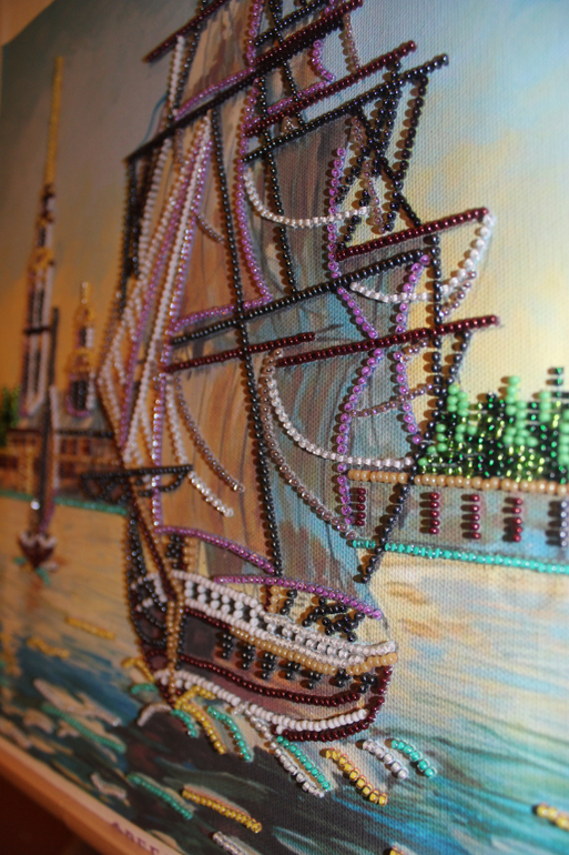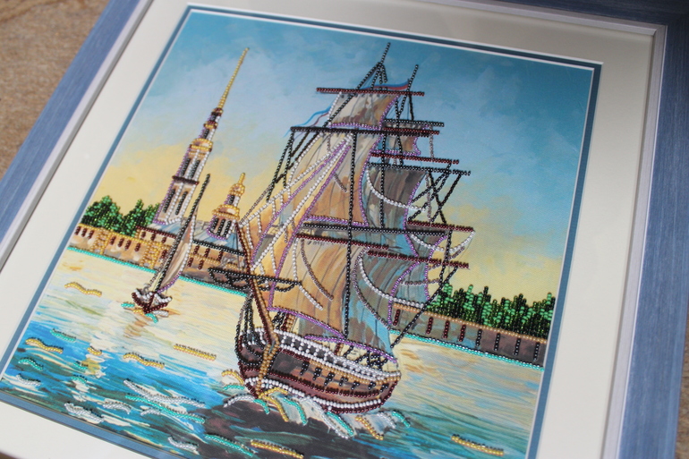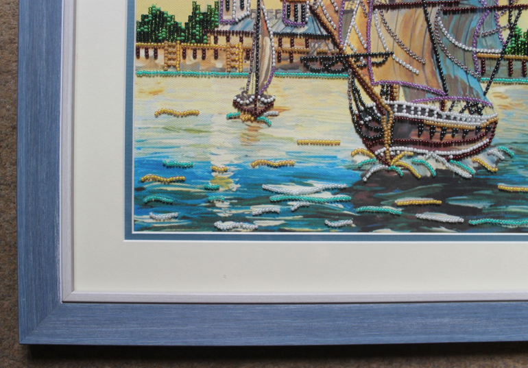 Купила через СС, вот только родной бисер подобрать не получалось. В иголочке мне подобрали, они когда то чешский в гамму переводили, но получалось так невзрачно, бисера не было вообще заметно, тк он был весь матовый. Распорола и начала заново. Решила сделать еще одну вылазку, в Леонардо подобрала такой же бисер, только глянцевый, времени кучу истратила, но результатом довольна. Ложился отвратно, плюс при оформлении натянули картину и вообще покосило прямые линии кое-где, но особо в глаза с расстояния в 1 метр не бросается.